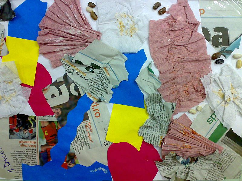 Aceasta este o lucrare A4 pe tema „1 Decembrie – Ziua Naţională a României” făcută de un elev de la Liceul Aurel Lazăr din Oradea. Tricolor asortat cu hârtie igienică, mizerie (care aduce a rahat), boabe de fasole şi presă de consum. Ge-ni-al! Bravo, copile! Aplauze pentru minţile luminate cu lanterna care te conduc. Nimeni nu a sesizat ironia, aşa că lucrarea a fost expusă. Îmi pare rău că nu am cumpărat-o.