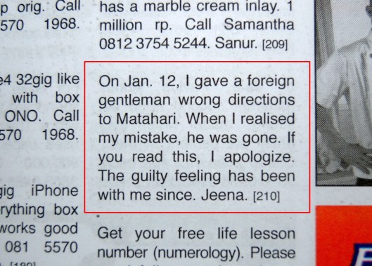 „În 12 ianuarie i-am dat unui domn străin indicaţii greşite pentru a ajunge la Matahari (un magazin, n.t.). Când mi-am realizat greşeala, plecase. Dacă citeşti asta, îmi cer scuze. Am un sentiment de vinovăţie de atunci. Jeena”