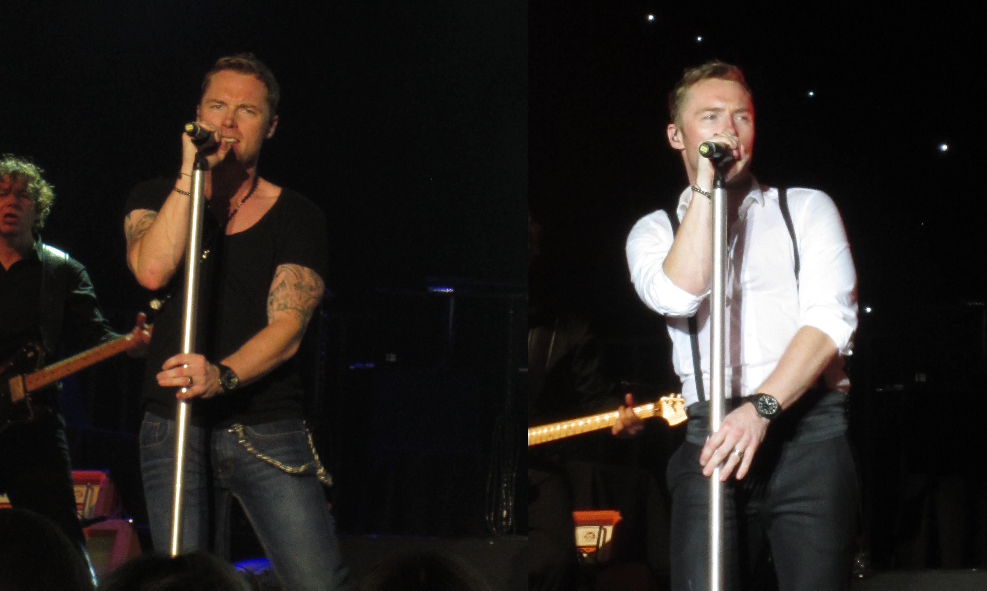 După ce a renunțat la sacou (dreapta), Ronan Keating s-a schimbat în tricou și blugi pentru bis (stînga).