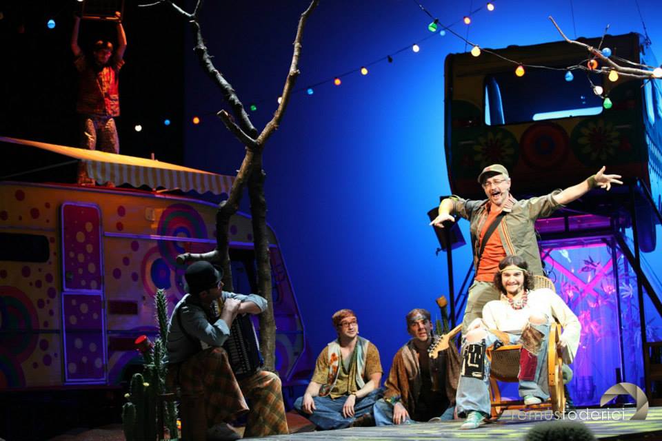 Da, spectacolul este un musical! Un musical pseudo-hippie, ironic şi sarcastic, puţin spre deloc emoţionant, reacţie afectivă care nici nu cred că s-a căutat. Pe mine m-au emoţionat rulotele de pe scenă, atunci când dădeau semne că-şi vor lua zborul, sugerând starea de plutire generală. Acţiunea din planul doi, foarte bogată şi aproape continuă, solicită serios atenţia. Spectacolul parodiază în o oră şi 40 de minute cam tot ce mişcă – liderii, lenea, dragostea, slugărnicia, femeile, relaţiile dintre oameni, falsitatea socială şi multe altele.