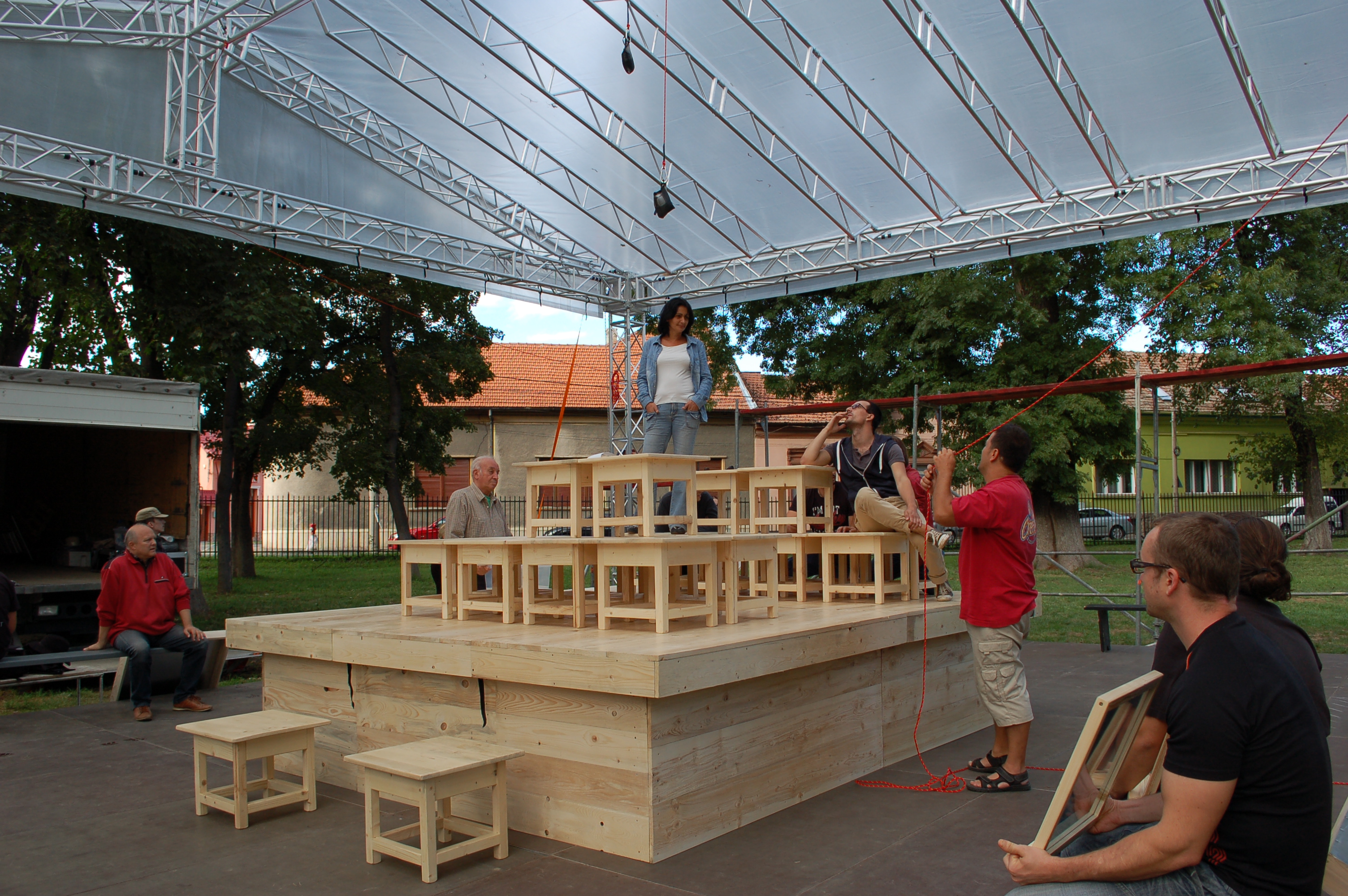 În Parcul Nicolae Bălcescu a răsărit o scenă metalică gigantică. E argintie, sclipitoare şi cu acoperiş alb. La 10 metri de ea, un tobogan gonflabil roşu, mare şi el. În ambele locuri se joacă, dar nu în acelaşi fel. În vreme ce pe tobogan se caţără copii fericiţi de iluzia unui derdeluş în miez de vară, pe scenă 15 actori de la Teatrul Regina Maria pregătesc joaca din toamnă. Pe podeaua de sub monstrul metalic e un podium şi o mini-piramidă din scaune de lemn. În acest decor se naşte, în văzul lumii, o piesă de teatru.