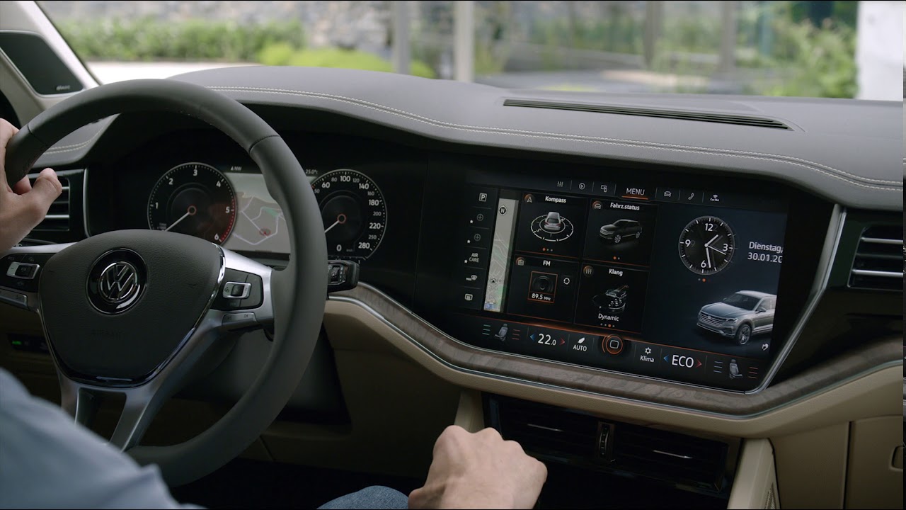 Distracția începe după ce deschizi portiera. E recomandabil să stai câteva minute în parcare ca să te obișnuiești cu bordul și butoanele, mai exact cu superba lor absență. Touareg-ul 2019 are un display mai mare decât orice tabletă de pe piață. De acolo se accesează și se setează totul – radioul, telefonul, opțiunile multi-media, sistemul de sunet (un fleac, 730 de wați 🙂 ) climatizarea pe 4 zone, navigația GPS, rețeaua Wi-Fi din mașină (doar nu vrei să se uite copiii afară, pe geam, în timpul călătoriei!), asistența la parcare laterală sau cu spatele (iubitele, soțiile și amantele vor iubi asta), modul de conducere (confort sau sport), consumul, diverse statistici și multe alte unelte ale diavolului care le plac atât de mult sfințiilor ante-pomenite.