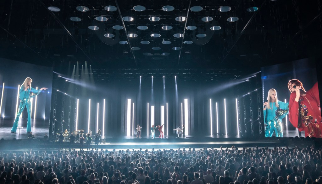 În stânga scenei, într-o fosă mobilă care urcă și coboară din când în când, muncește de nouă ori pe săptămână probabil cea mai bună trupă ABBA-tribute din lume (tobe, percuție, bass, 2 chitare, clape, suflător, 3 backing vocals). Amănunt – formația e majoritar feminină! Vocile celor 4 membri originali sunt cele reale, de pe trackuri, cu ajutor suplimentar de la cele 3 doamne vocaliste. Totul în sincron perfect cu hologramele care cântă și dansează.