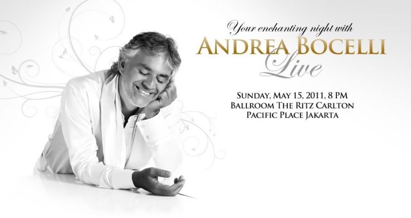 A fost prima prezenţă a lui Andrea Bocelli în Indonezia, iar evenimentul s-a vrut a fi grandios, chiar exclusivist. Locaţia concertului, sala Grand Balroom din Hotelul Ritz-Carlton, Pacific Place, numărul mic de locuri (aproximativ 2.000) şi preţul biletelor (între 260 şi 1.600 de dolari) au fost semnale suficient de clare. În mod normal, preţurile prea mari îi ţin la distanţă pe adevăraţii iubitori de muzică clasică şi populează sala cu snobi bogați și semi-educaţi muzical, care cunosc maxim 2-3 melodii de-ale artistului, cele mai comerciale. Pe lângă asta, sala nu a fost plină, ceea ce, într-un oraş de aproape 10 milioane de locuitori, mi se pare inacceptabil.